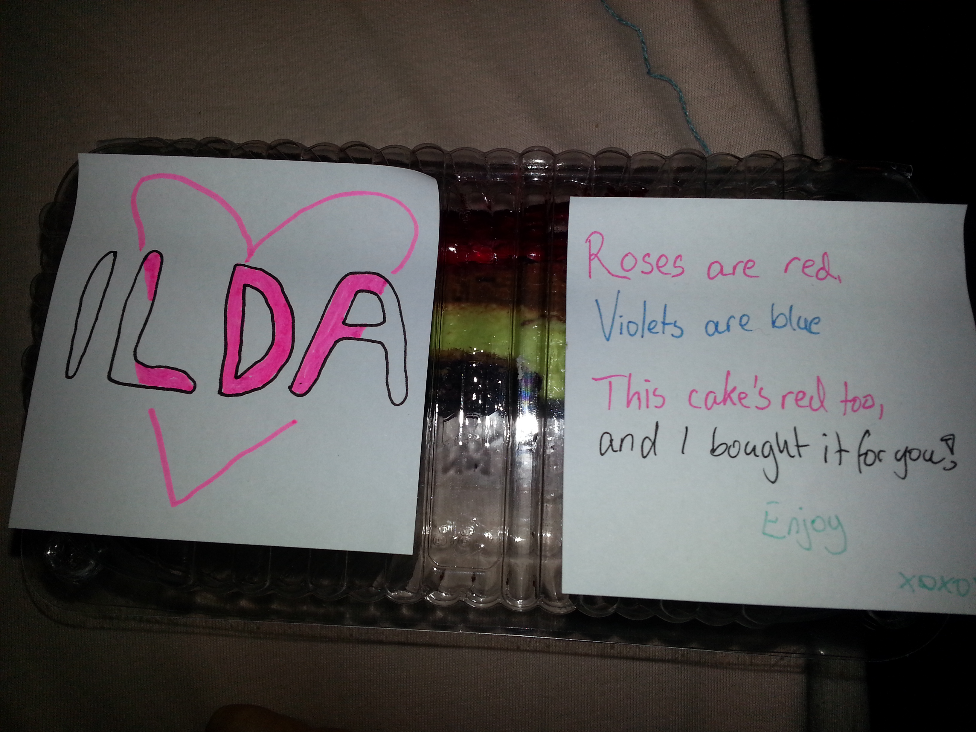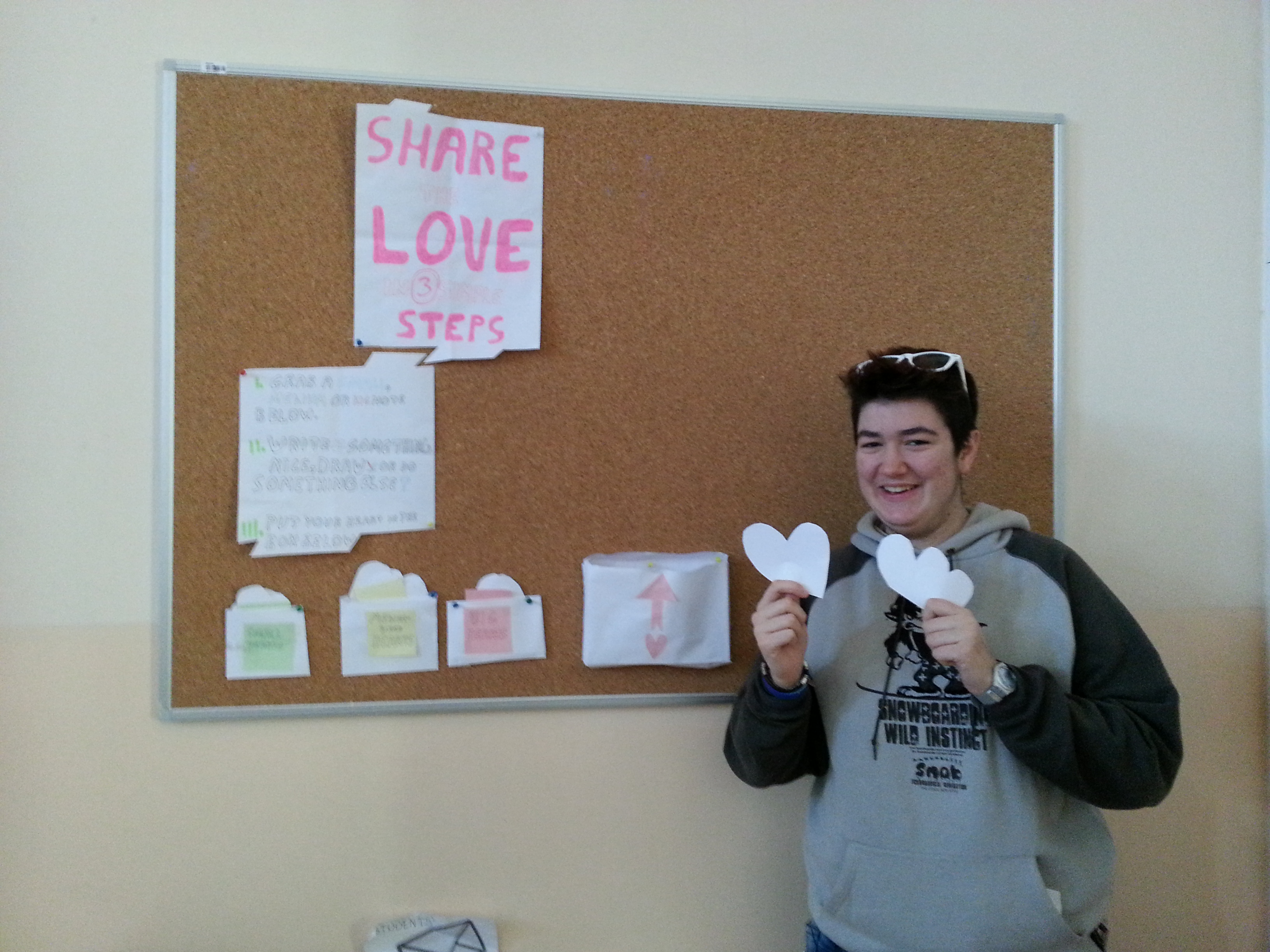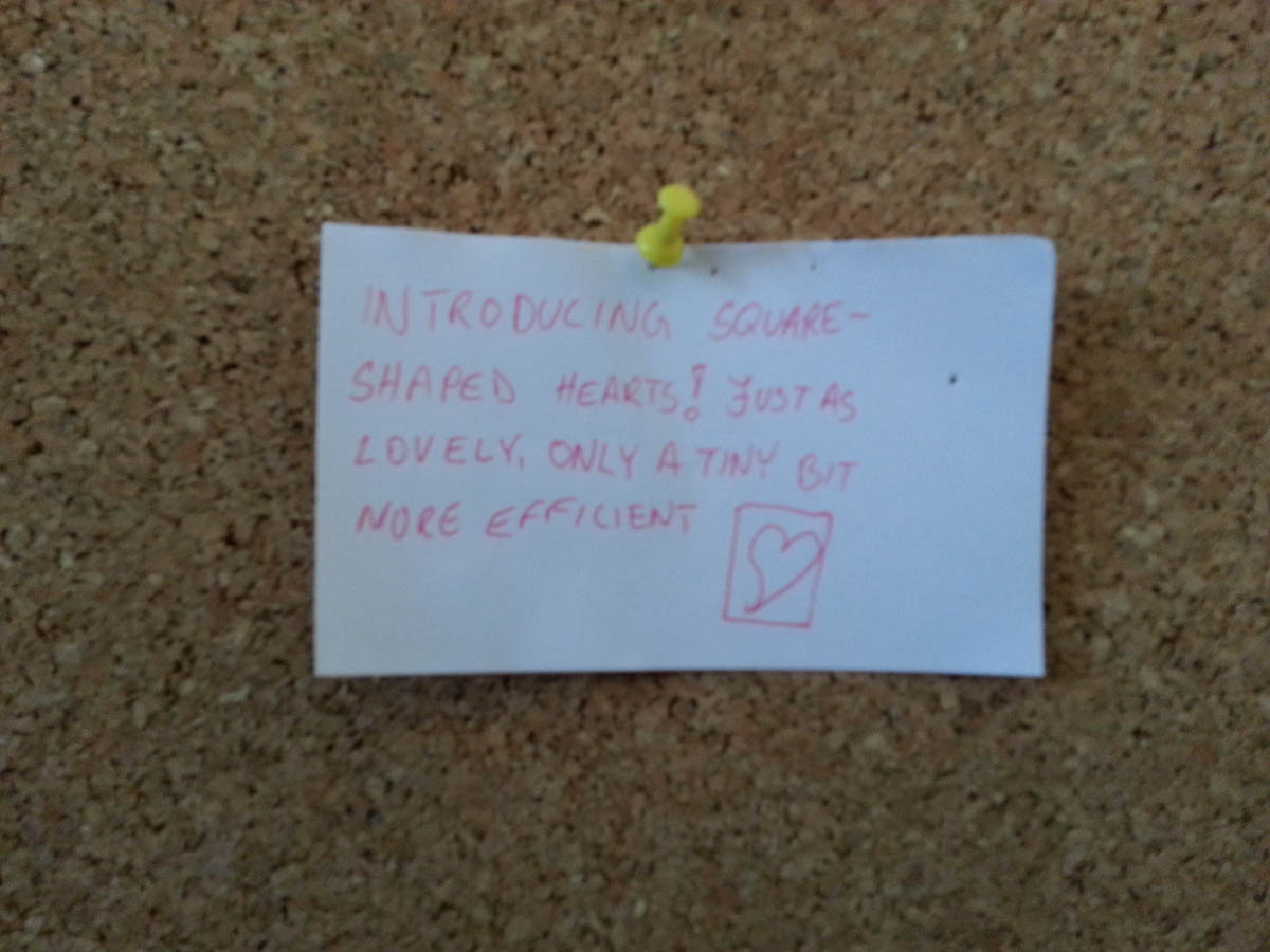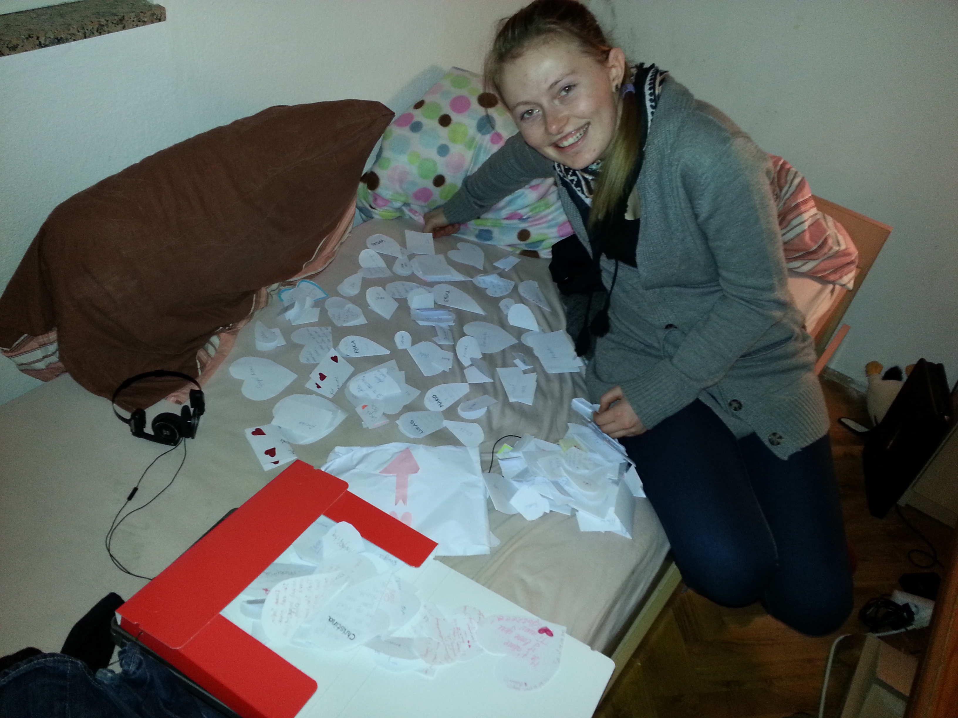 Brorparten av gårsdagens kveld gjekk med til å klippe opp enorme megder hjarte av alle storleikar, og til å utforme «valentinskortsystemet» over, der alle har høve til å ta eit hjarteforma kort og skrive eit par velvalgte ord til nokon eller noko. Alt to timar etter korta var på plass var imidlertid samtlege hjarte oppbrukt, og eg måtte då ta drastiske grep. Den resterande kjærleiken vart formulert på noko ukonvensjonelle, men veldig effektive «rektangelhjarte».