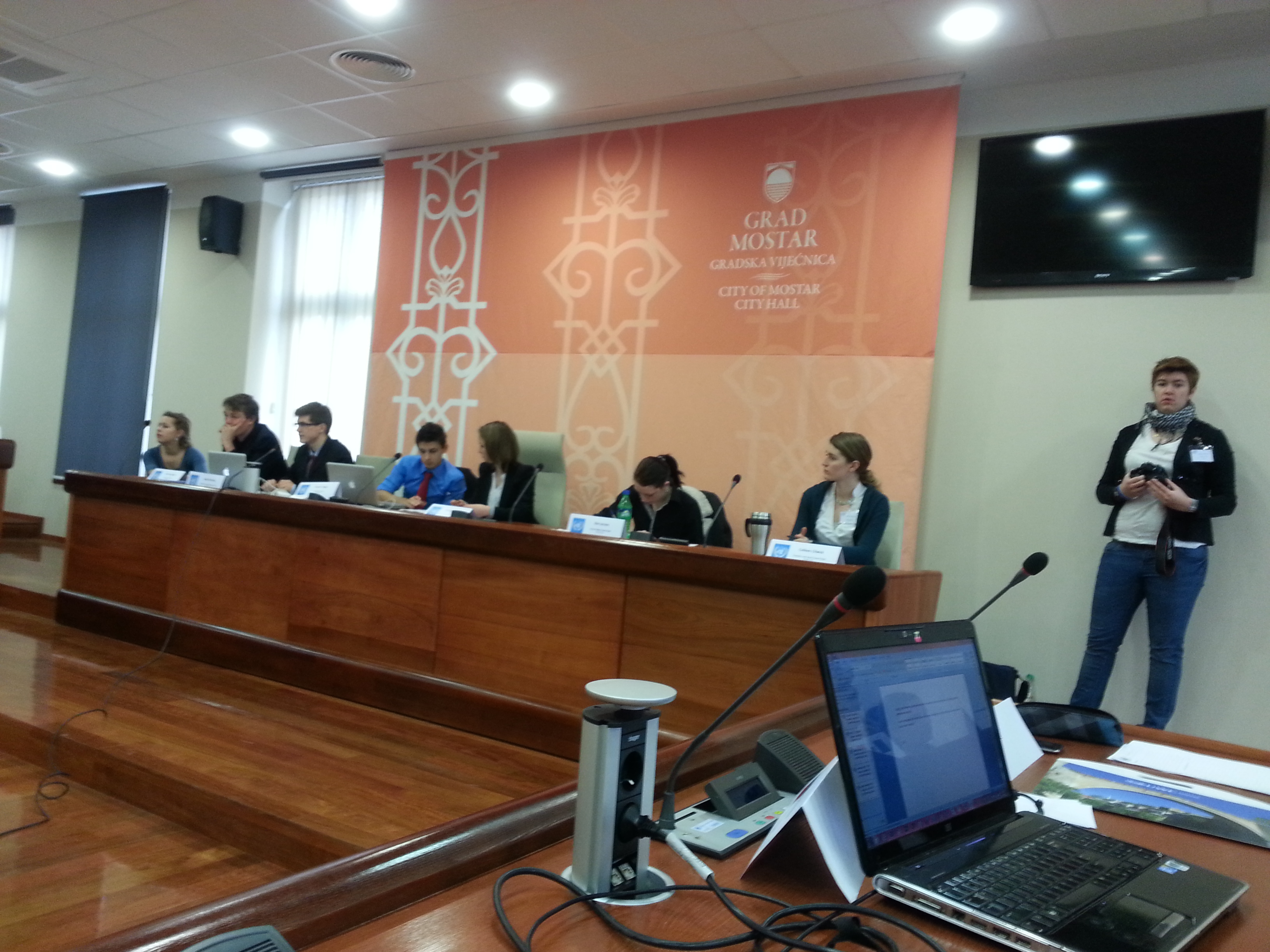 Våre kjære sekretariatsleiarar. Vi nytta kommunestyresalen til Mostar, som er så ny at han endå ikkje har vorte nytta av representantane sjølve!